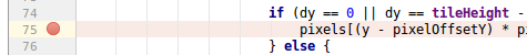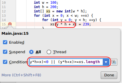 Этот код падает: Exception in thread "main" java.lang.ArrayIndexOutOfBoundsException: 20000 с указанием строчки xs[y * h + x] = 239;. Простая точка остановки не подходит, т.к. исполнение падает не сразу, и лишь где-то в конце.