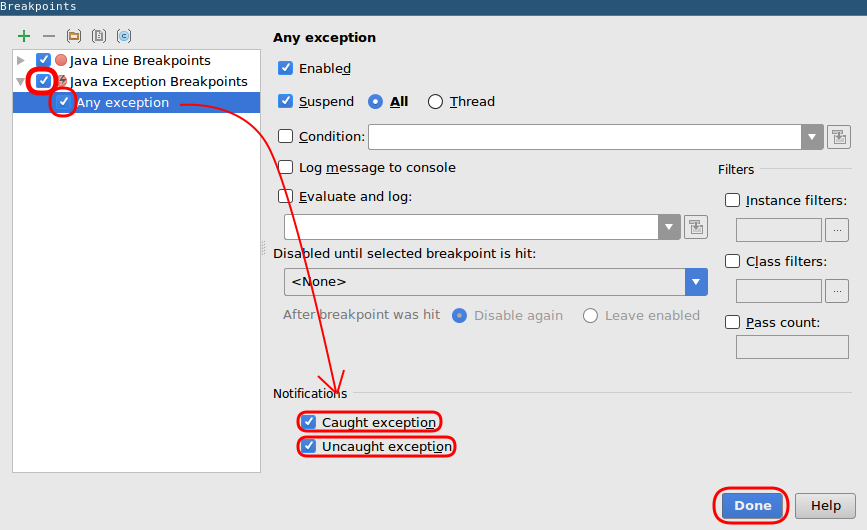 Java Exception BreakpointsAny exceptionCaugh exception(остановка исполнения по исклчениям которые где-то будут обработаны)Uncaugh exception(остановка исполнения по исклчениям которые приведут к падению потока исполнения)
