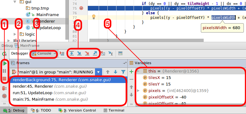 - Stacktrace - все вложенные вызовы функций которые привели вас в то место, в котором сейчас программа отлаживается (т.е. это последовательность вызовово в коде, при нажатии на одну из строк стектрейса - IDE телепортирует вас в соответствующее место в коде)